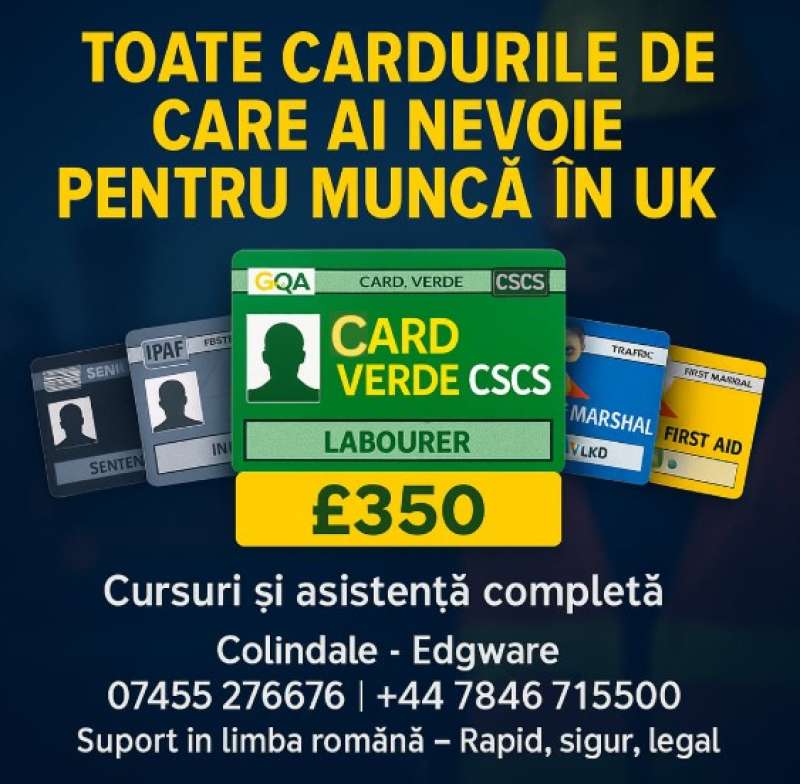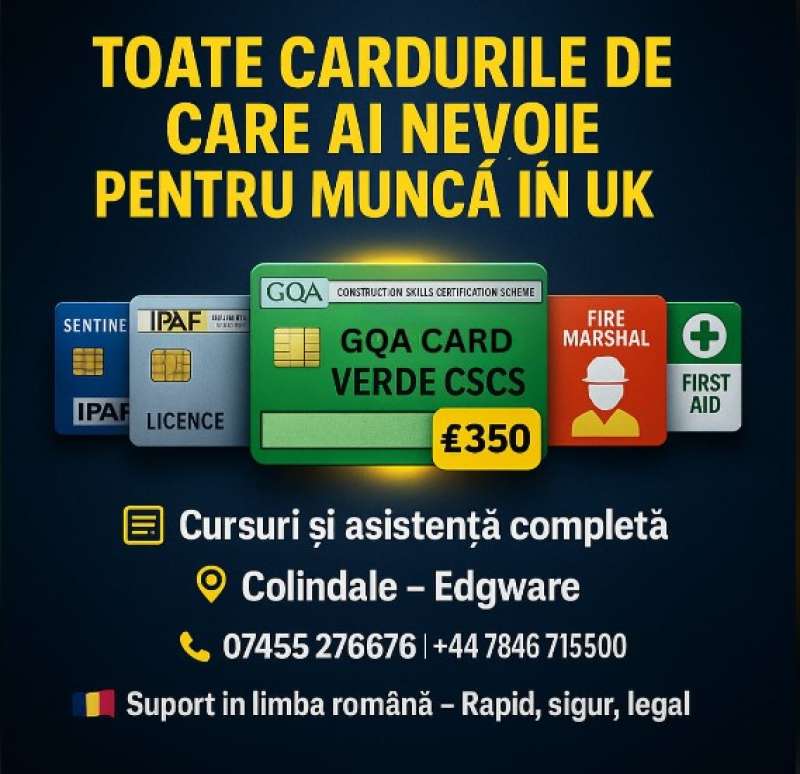 La centrul nostru din Colindale – Edgware, te ajutăm să obții toate tipurile de carduri și calificări esențiale pentru a lucra legal și în siguranță în Marea Britanie.