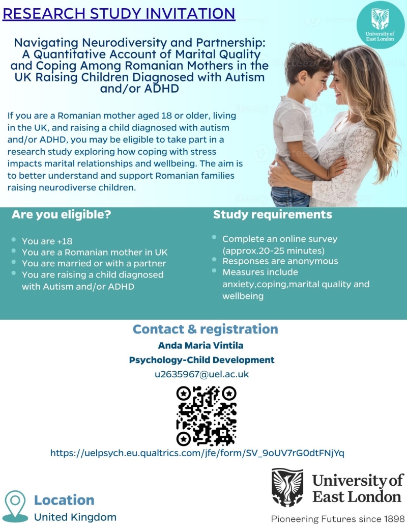 Numele meu este Anda Vintila si realizez un #studiu academic la University of East London, dedicat #mamelor #românce care locuiesc în Marea Britanie și care cresc copii diagnosticați cu #autism și/sau #ADHD.